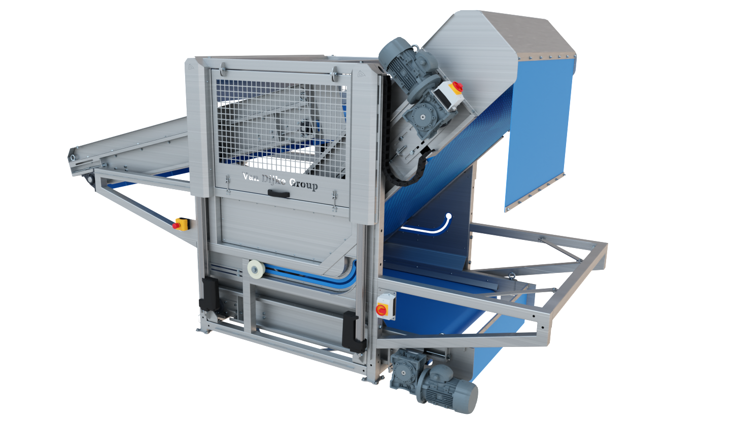 De van Dijke loofscheider Egelband is ontwikkeld om loof / bladeren en wortelresten te verwijderen voordat het product in de waslijn komt. De unit kan zowel op een eigen frame staan, maar kan op perfect direct op een ontstener geplaatst worden, zodat de benodigde ruimte nihil is.