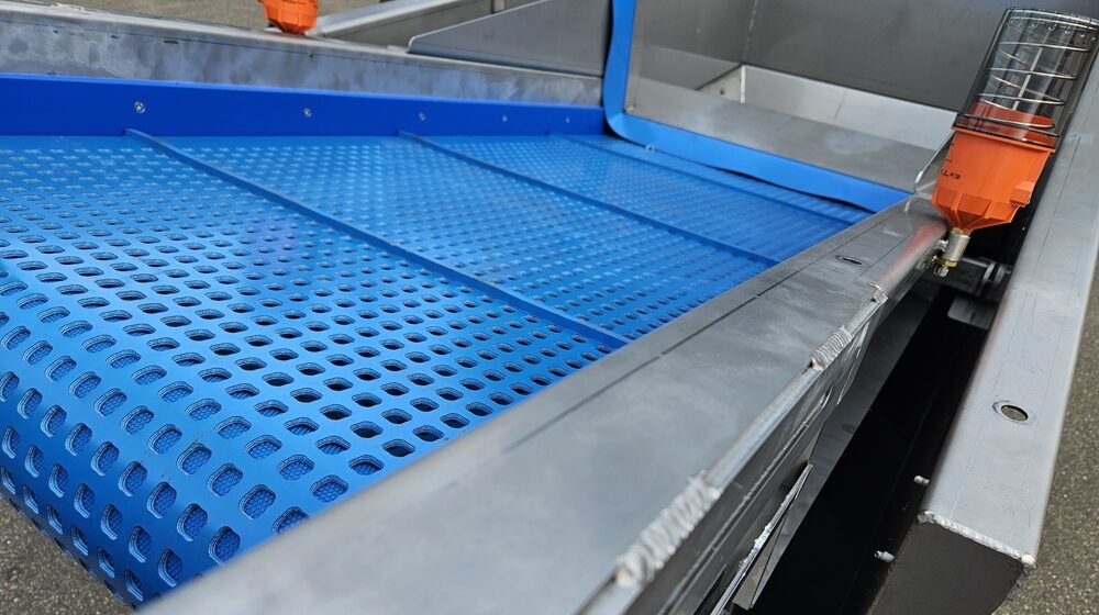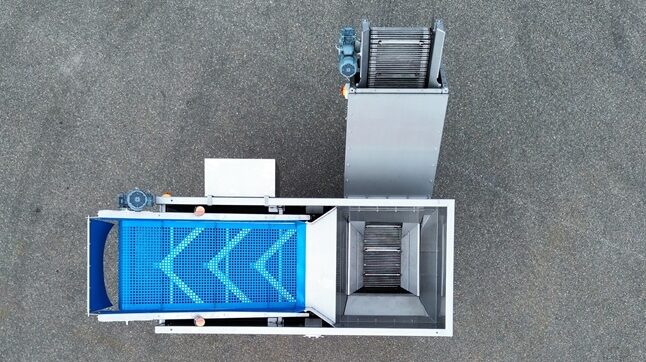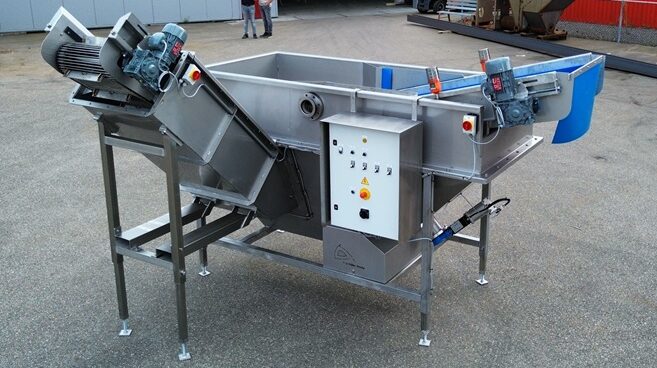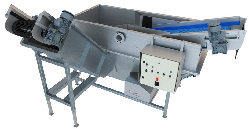 Het systeem scheidt zware delen zoals stenen en kluiten van de producten door middel van een instelbare opwaartse waterstroom, waarmee het scheidingsproces heel nauwkeurig kan worden ingesteld. Het water wordt intern in de machine rondgepompt, waardoor slechts een kleine hoeveelheid schoon (of gerecycled) water nodig is. Daarnaast is de machine uitgerust met intern bezinksysteem , dat ervoor zorgt dat het water in de machine intern gerecycled kan worden. Deze machine is tevens uitgevoerd met de nieuwste industriële kwaliteit uitvoerband en kopschraper.
